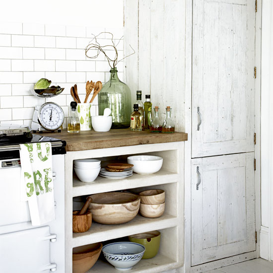 Rustikálny štýl v kuchyni dotvárajú biele skrinky s presklenými dvierkami a lišty so zavesenými hrncami. Vyvarujte sa ale žulovým doskám a prístrojom z nehrdzavejúcej ocele - tieto sú na rustikálny štýl príliš sofistikované.